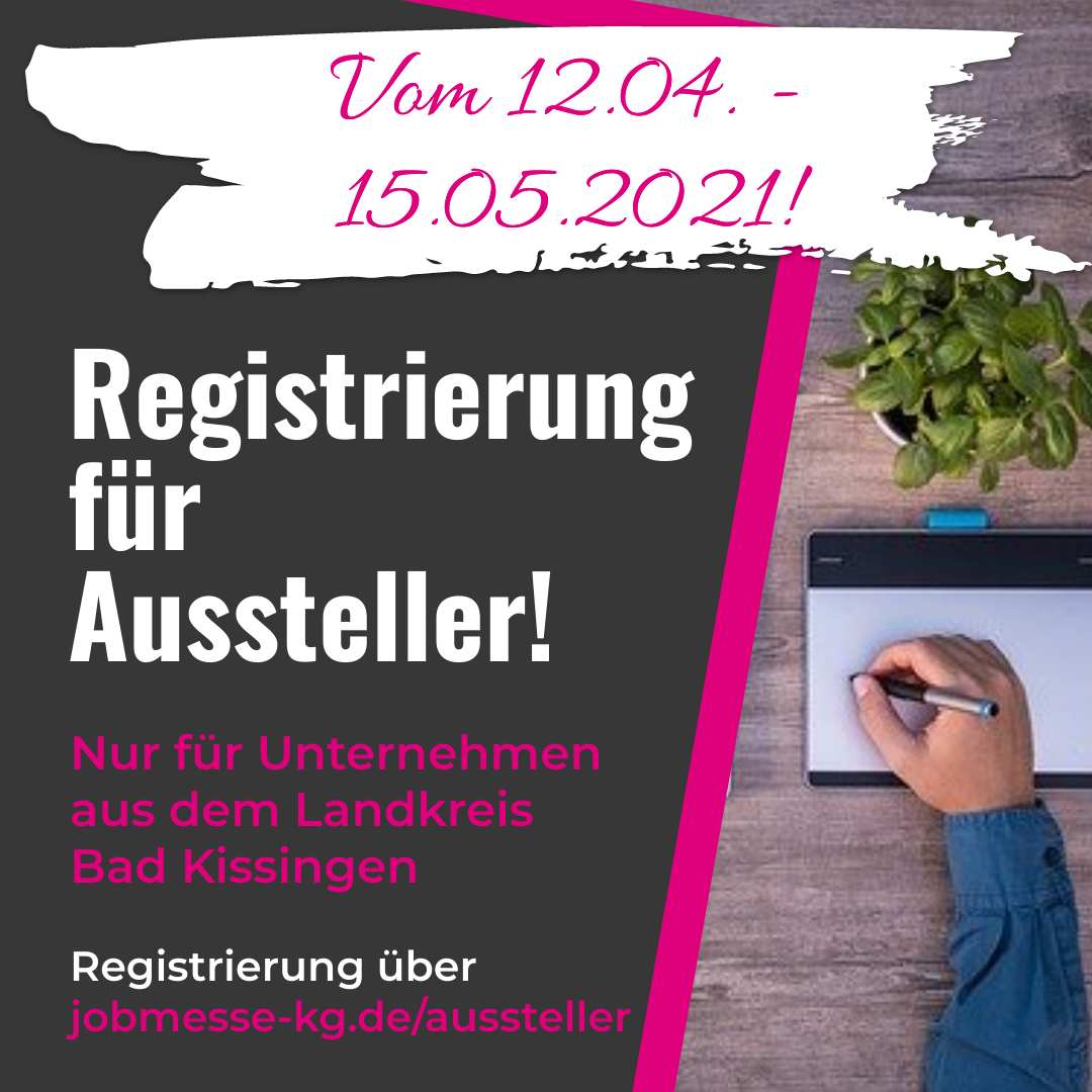 Ab Montag, den 12.04.2021 ist die Registrierung für interessierte Aussteller der Jobmesse Bad Kissingen freigeschalten. Die Online-Anmeldung ist bis einschließlich Samstag, den 15.05.2021, über die Website www.jobmesse-kg.de/aussteller möglich.